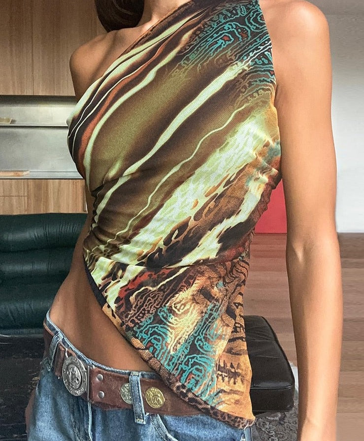 Irregular Print Tanks Tops Women Unique Incline Shoulder Sleeveless Body-shaping Hipster vest Female Streetwear