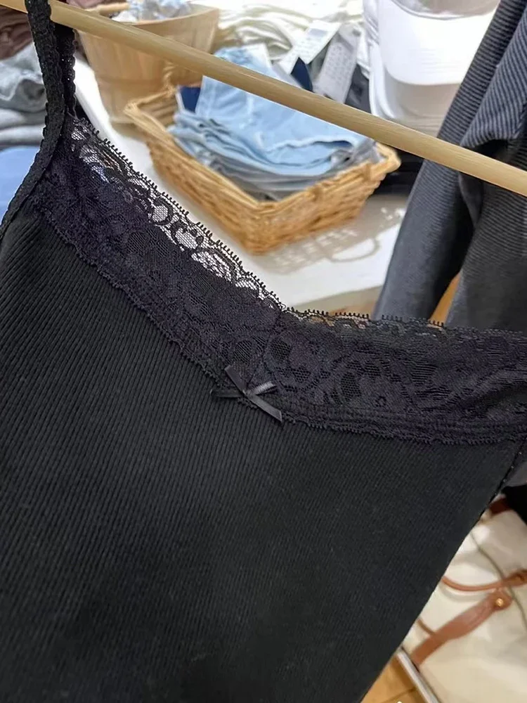 Vintage Women Lace Trim Bow Tank Tops Summer Ladies Casual Cute Black Cotton Camis Female Sweet Y2k Slim Crop Top